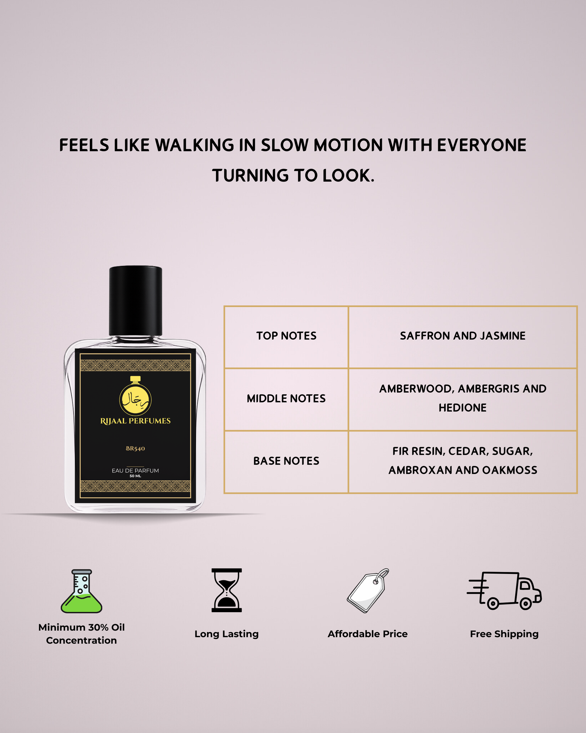 The opening of our Inspired by Rouge 540 features a gentle sweetness of saffron paired with delicate jasmine. This evolves into a warm, resinous heart of amberwood and ambergris, before settling into a subtle woody base of cedar and fir that feels fresh, smooth, and enveloping.